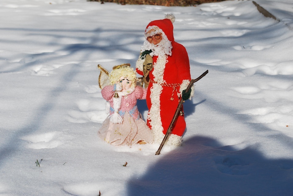 Któregoś wieczora zdumiał się, widząc postać przebiegającą ukradkiem pod ścianą domu, do którego właśnie zmierzał z workiem prezentów. Był to ktoś bardzo do niego podobny, jakby cień jego samego. Ale zdumienie było jeszcze większe, gdy odkrył, że dziecięce pończochy, które pragnął wypchać wspaniałymi podarunkami, już są pełne! Ktoś go ubiegł, ktoś go wyręczył!