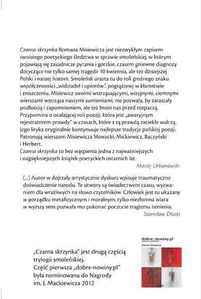 Torontońskie wydawnictwo „Sooni Project” opublikowało „Czarną skrzynkę” – nowy tomik Romana Misiewicza. Książka stanowi drugą część trylogii smoleńskiej polskiego poety, laureata Nagrody im. Kazimiery Iłłakowiczówny. Część pierwsza „dobre-nowiny.pl” była nominowana do Nagrody im. Józefa Mackiewicza w 2012 roku. Poniżej prezentujemy krytyczne notki z okładki książki i kilka utworów, zapisanych w „Czarnej skrzynce” Romana Misiewicza. ( z kronikarskiego obowiązku wypada odnotować, że Joanna Mądroszkiewicz, mieszkająca w Austrii skrzypaczka i poetka, napisała wcześniej wiersz, zatytułowany właśnie „Czarna skrzynka” )