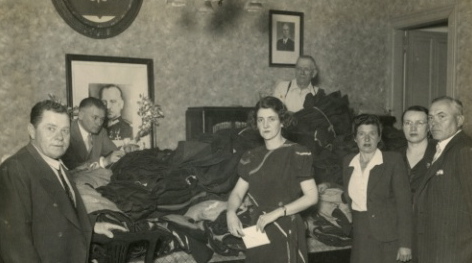 Listopad 1945, Buenos Aires;  Przygotowywanie paczek w Komitecie Niesienia Pomocy Ofiarom Wojny. Od lewej stoją: Stanisław Zawadzki, Stanisław Pyzik, Irena Dostalowa, Stanisław Czyżewski, Szymańska, Zawadzka, J. Szymański.  Listopad 1945, Buenos Aires