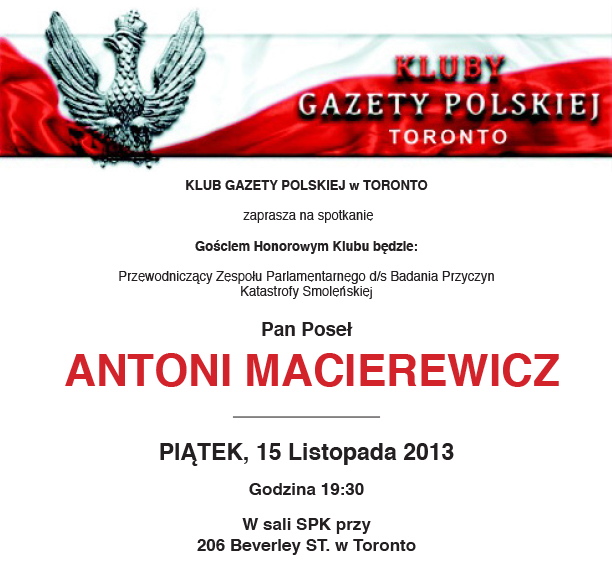Antoni Macierewicz w Toronto: 15 listopada, SPK 19.30