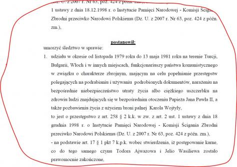 Sześć dni przed 33. rocznicą zamachu na Jana Pawła II śledztwo, które prowadził w tej sprawie od roku 2006 Instytut Pamięci Narodowej zostało umorzone. Ówczesny prezes instytutu Janusz Kurtyka podjął decyzję, że zajmą się tym prokuratorzy pionu śledczego IPN w Katowicach.