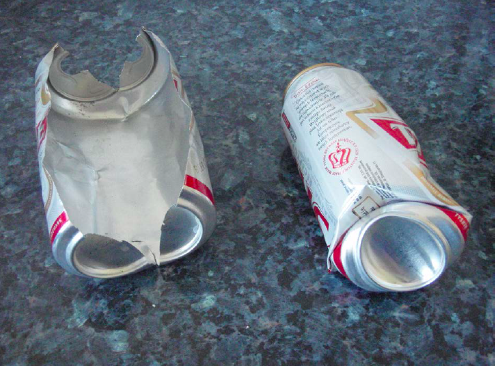 Równie dobrym przykładem jest cienkościenna konstrukcja powłokowa, jaką stanowi puszka piwa lub napoju. Każdy z nas wielokrotnie mógł zaobserwować, jak wygląda zgnieciona puszka. Na skutek działania z zewnątrz w żaden sposób nie da się puszki rozerwać. Jeśli widzimy puszkę rozerwaną, nie ma wątpliwości, że przyczyną było wewnętrzne ciśnienie. I nie trzeba żadnego profesjonalnego wykształcenia, aby rozróżnić, która z puszek przedstawiona na rys. 10 została zgnieciona, a która rozerwana.