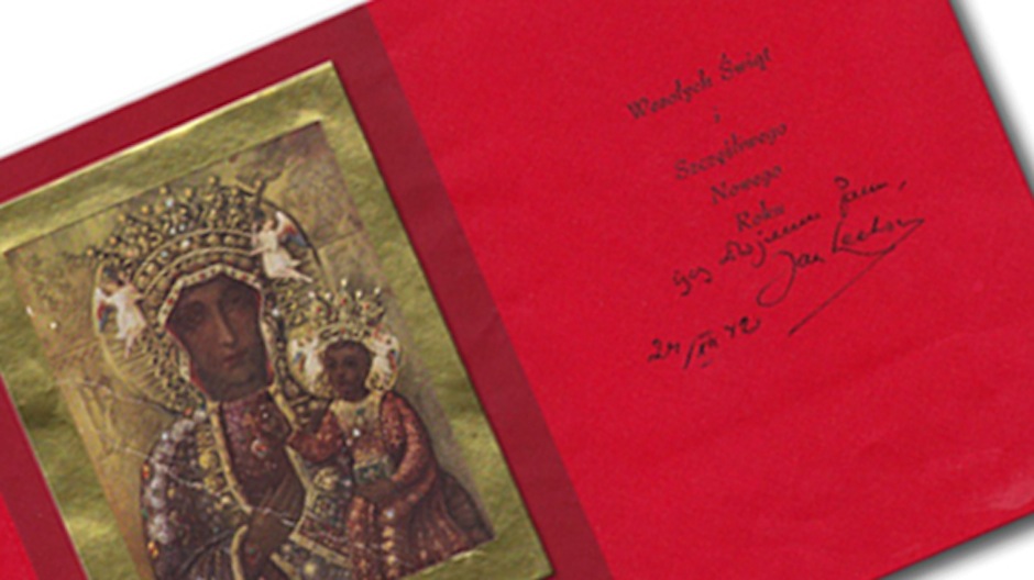 Sygnowana „Róża wiatrów”, sama będąc białym krukiem, kryła jednak prawdziwy skarb: ręcznie wyklejoną kartkę świąteczną z wizerunkiem Matki Boskiej Częstochowskiej, z wydrukowanym na czerwonym papierze wierszem Lechonia „Matka Boska Częstochowska” i życzeniami wigilijnymi, podpisanymi przez autora wiersza. Dedykacja była zapewne przeznaczona dla Mieczysława Zagajskiego (nazwanego „drogim Panem”), a kartka wydrukowana przez „Polish Women’s Relief Committee” nosi odręcznie przez Lechonia napisaną datę 24/XII 1942. Dokładnie siedemdziesiąt lat temu!
